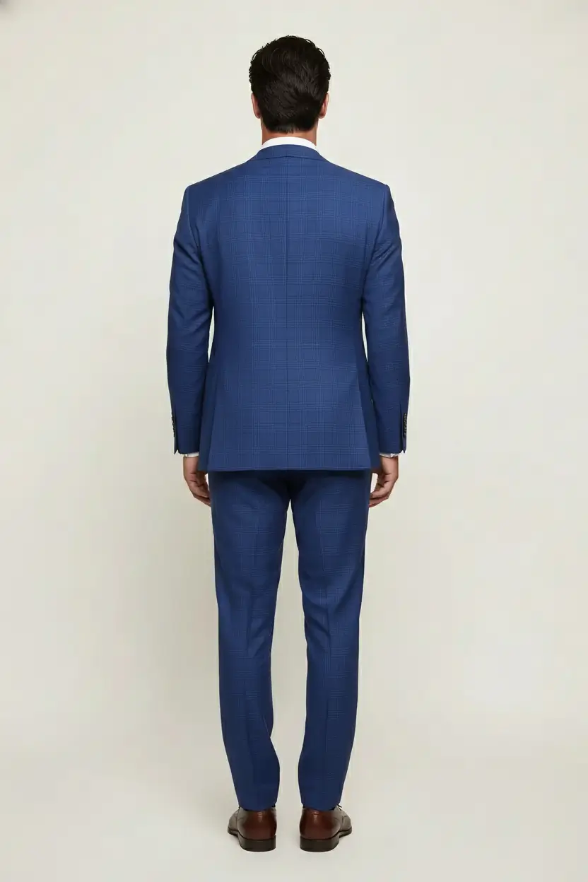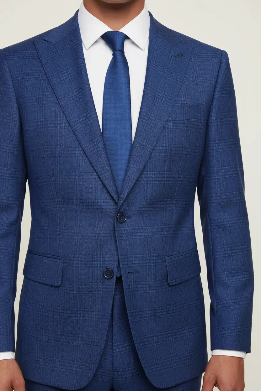 This royal blue suit stands out with its unique plaid pattern and modern fit. The vibrant color radiates confidence, making it perfect for social gatherings and events where you want to make an impression.