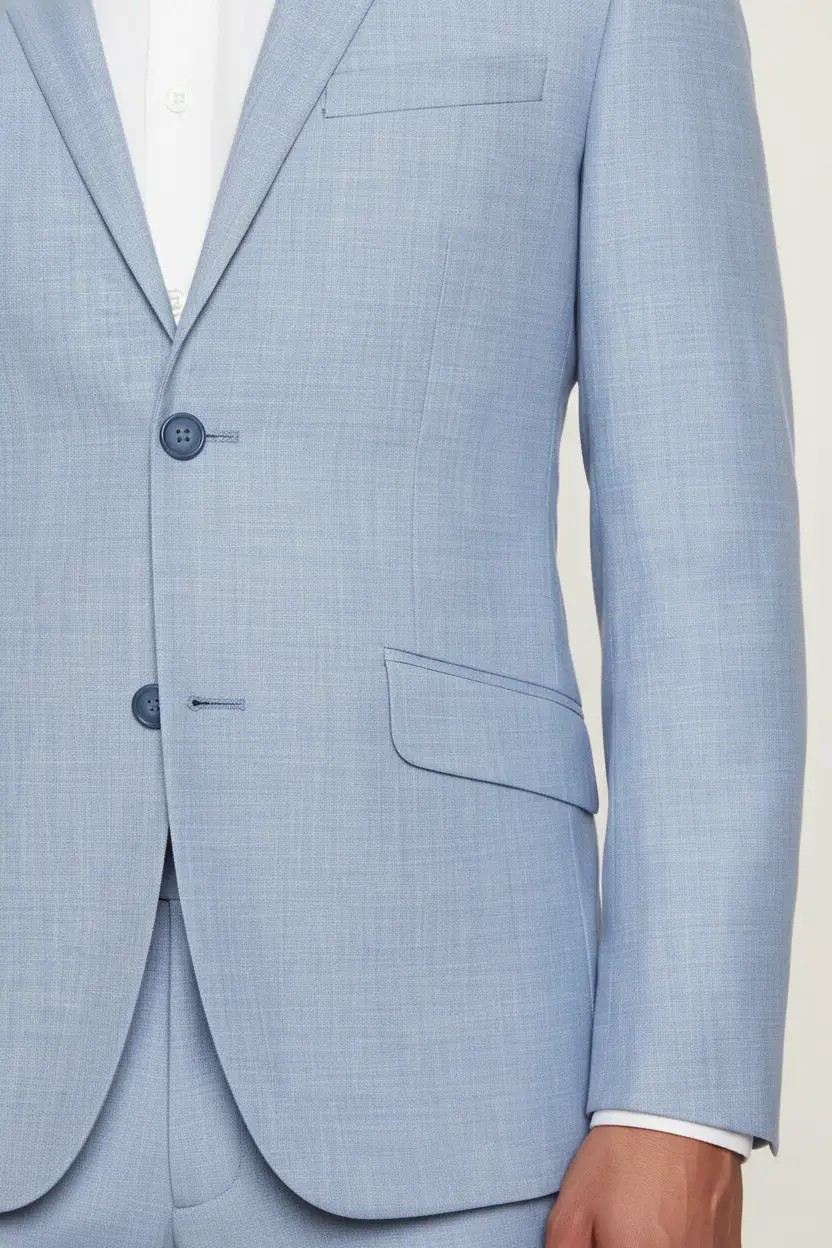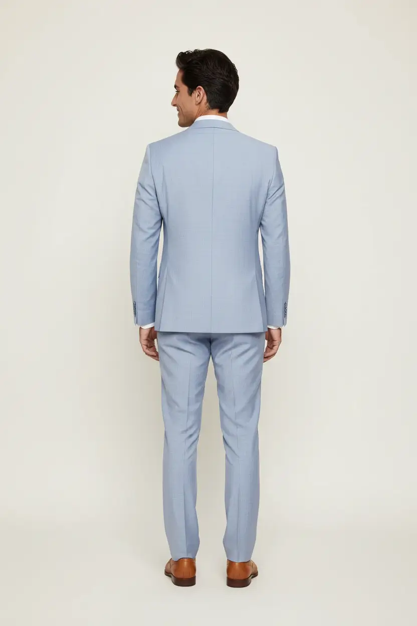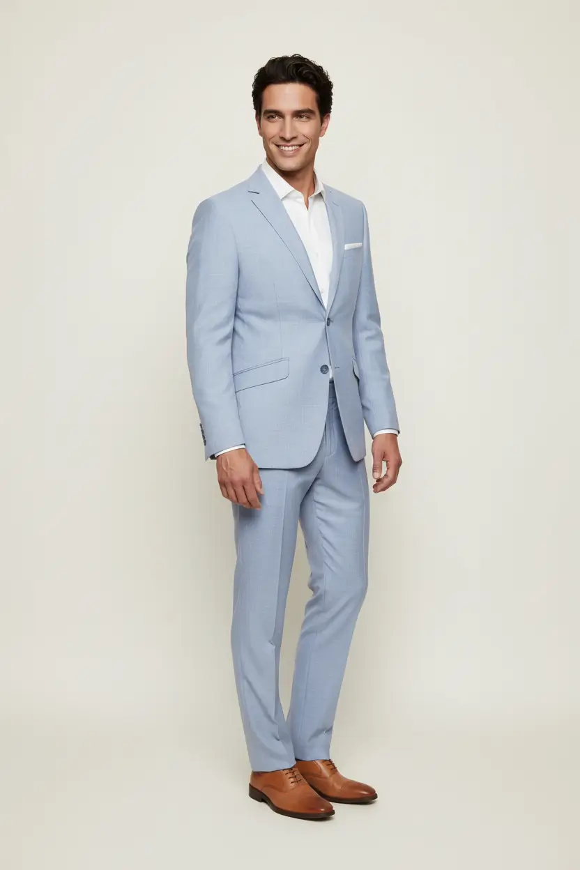Perfect for summer weddings, outdoor parties, or stylish business meetings, this suit keeps you looking sharp and feeling comfortable. Its light blue hue is an excellent choice for both day and evening events, allowing for seamless transitions from one occasion to another.
