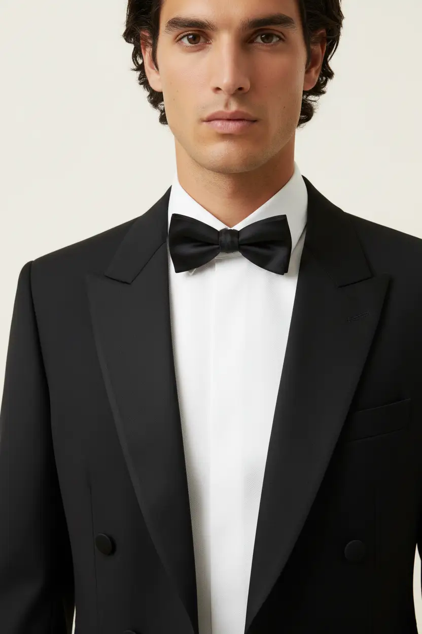 Classic full dress tuxedo with satin peak and adjustable pant.