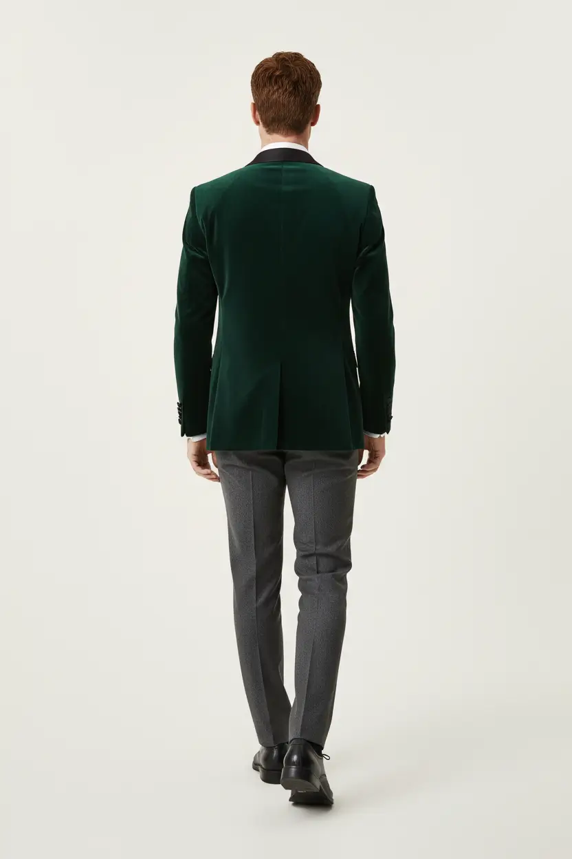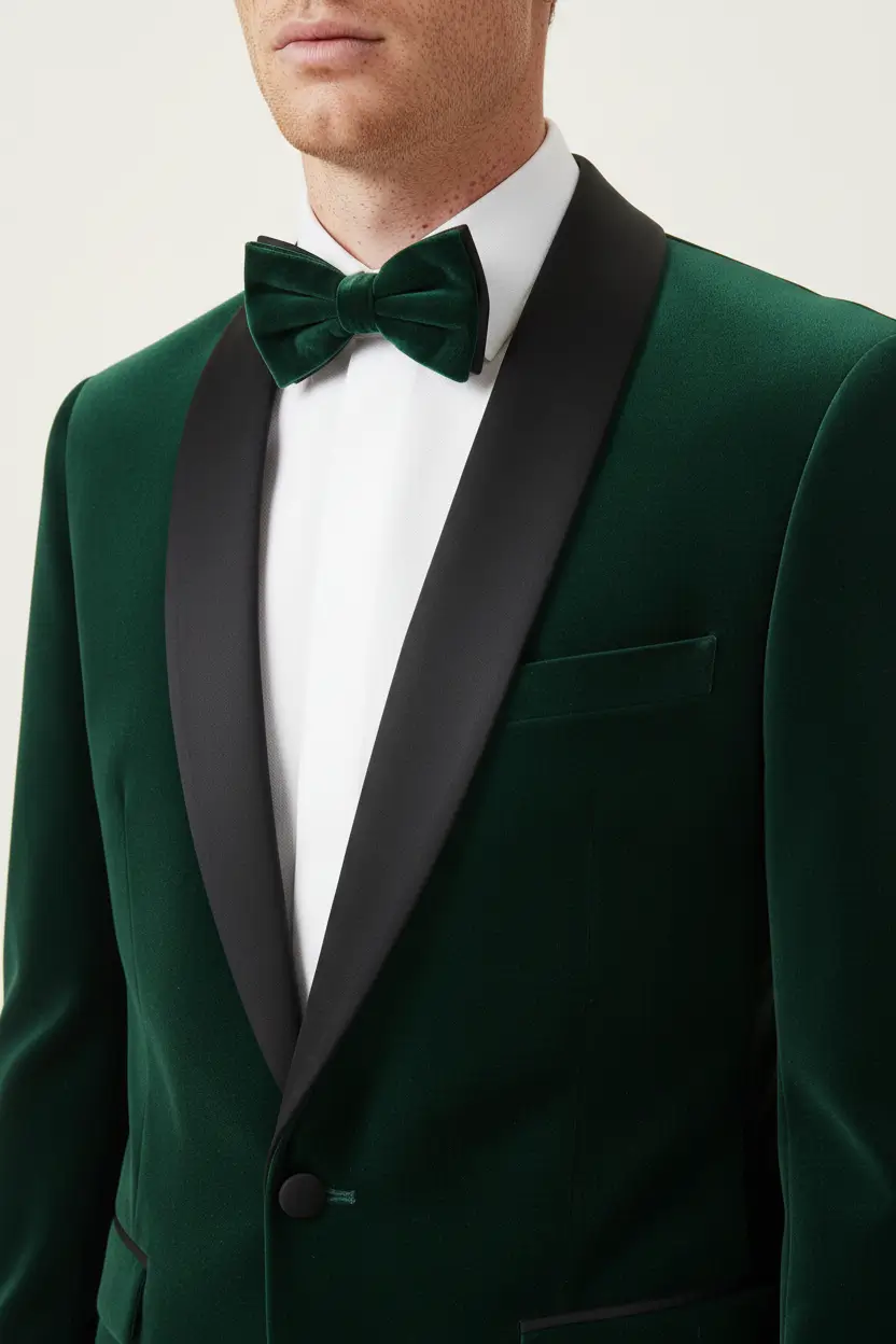Luxurious green velvet tuxedo with a shawl lapel, perfect for formal occasions.