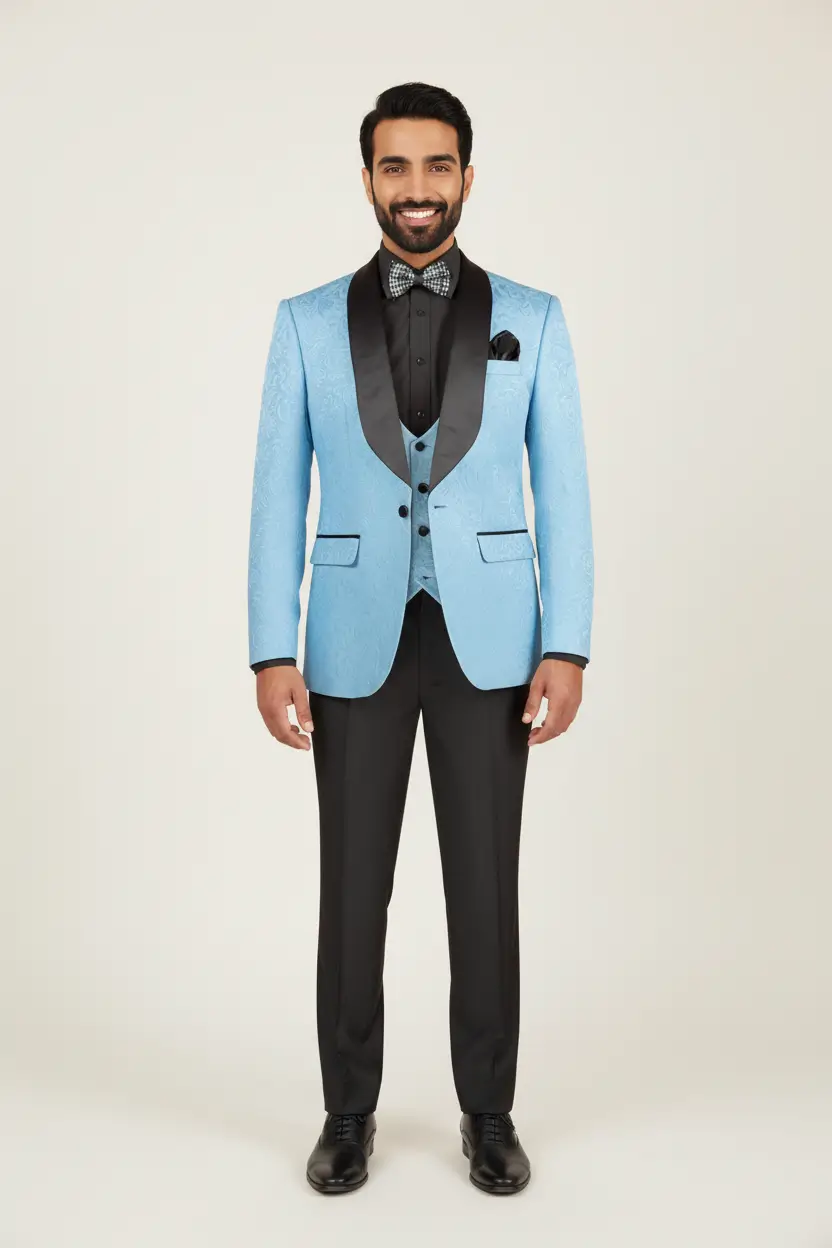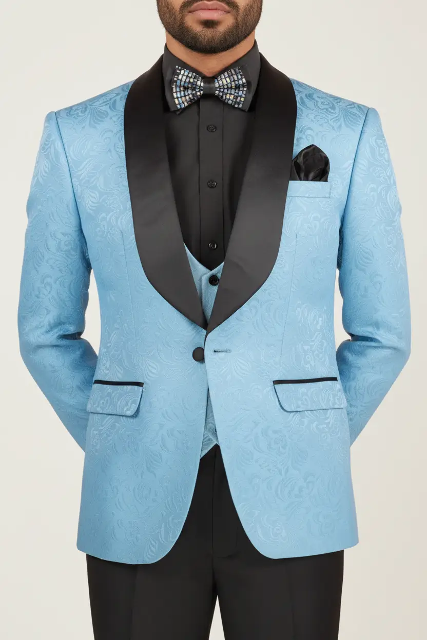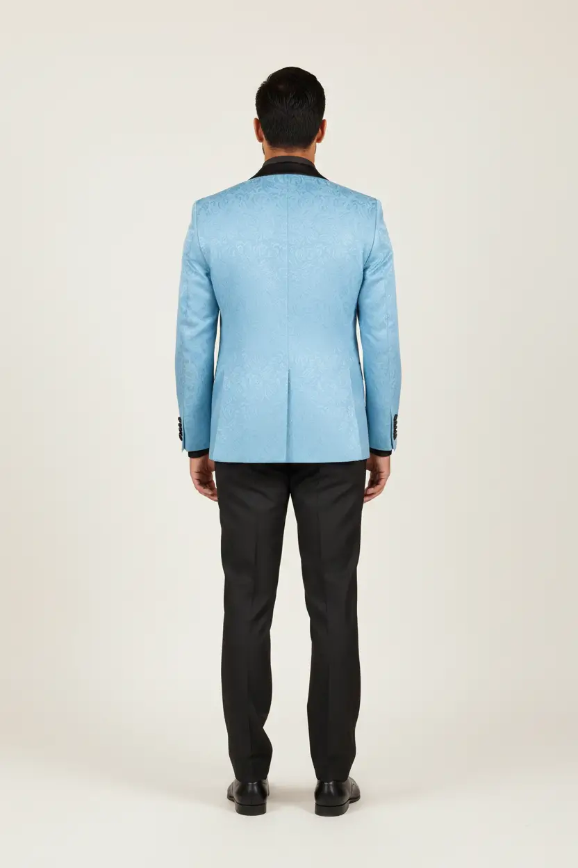A stylish light blue jacquard tuxedo with a slim fit design.