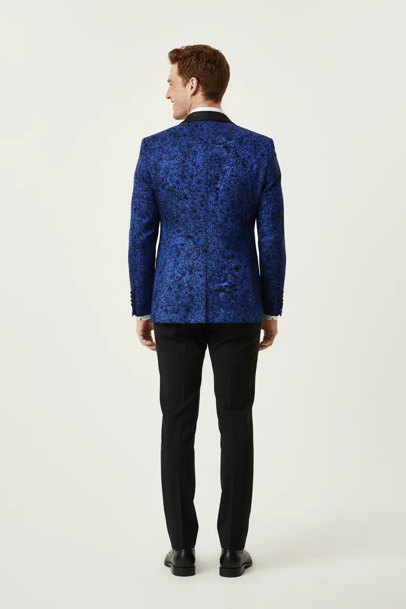 Stylish royal blue tuxedo with shawl lapel and intricate design.