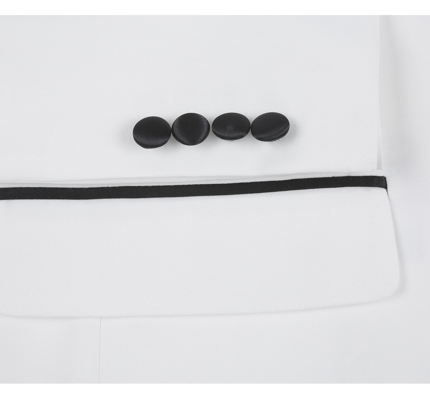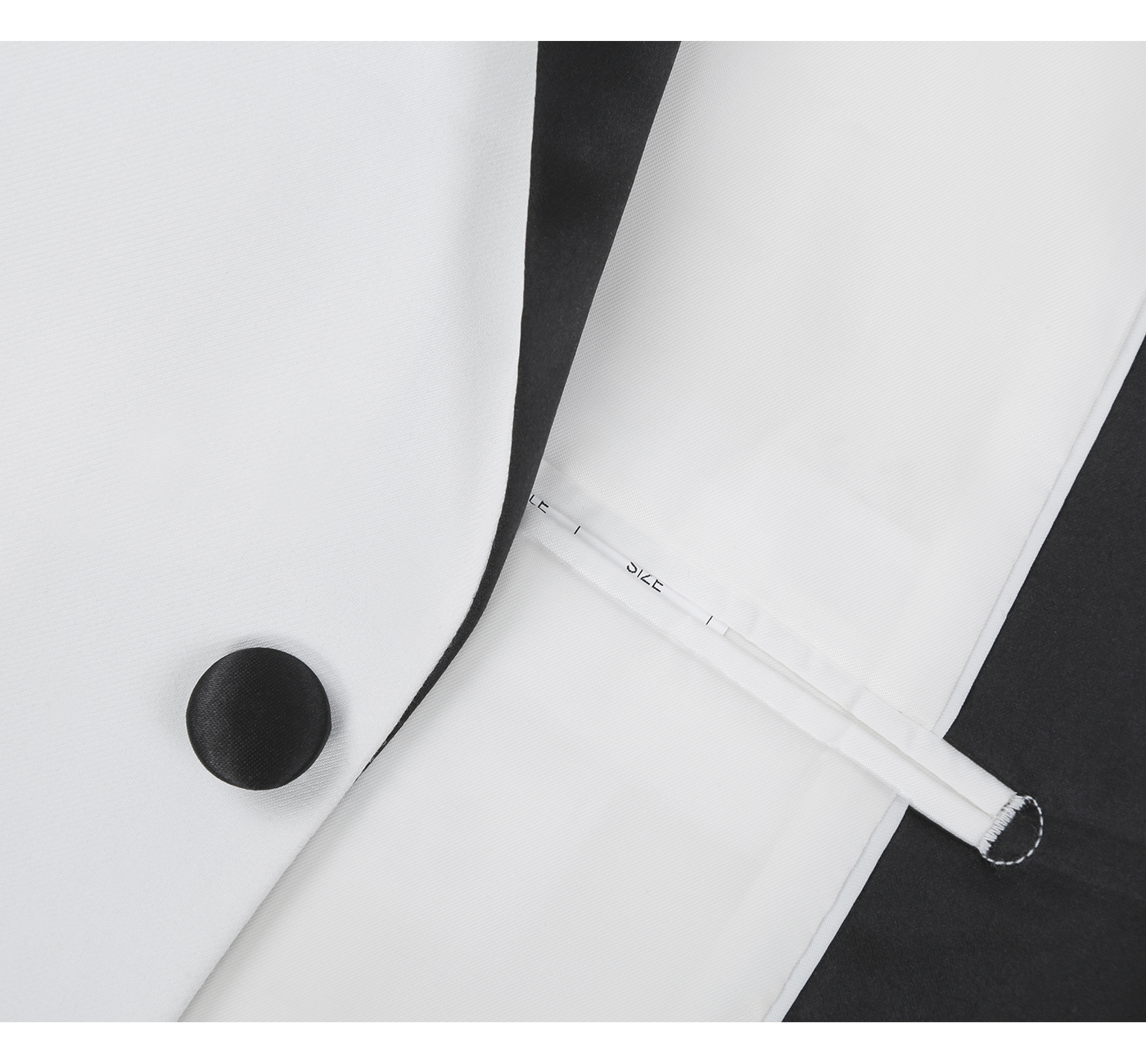 Elegant slim fit white tuxedo with black shawl lapel and single-button design.